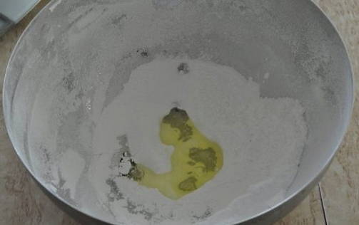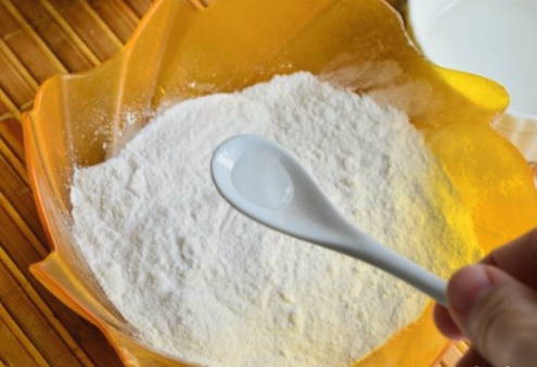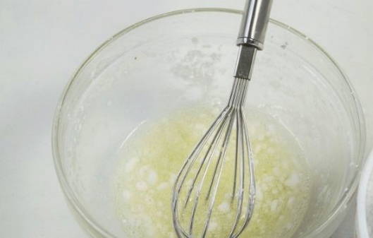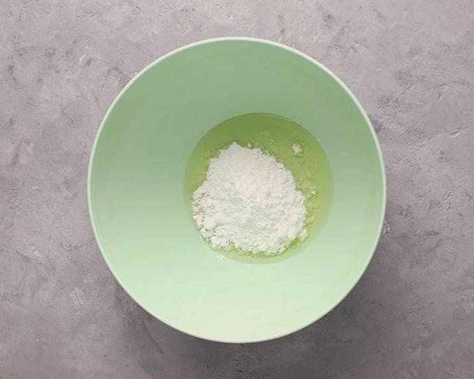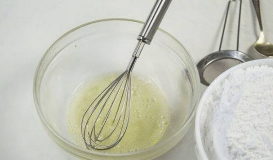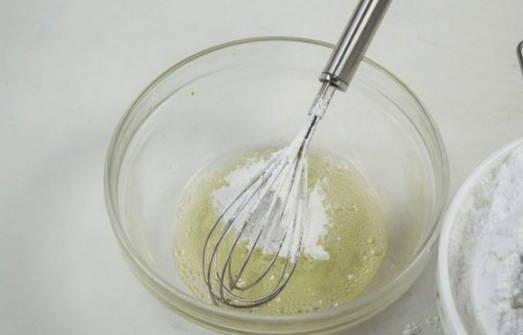 - Giet het eiwit dat van de dooier is gescheiden in een kom en zeef de poedersuiker erin, zachtjes kneden.