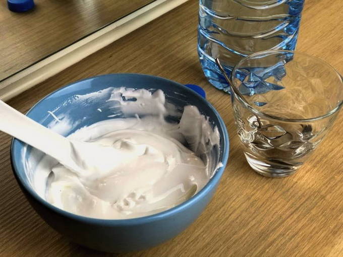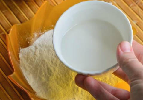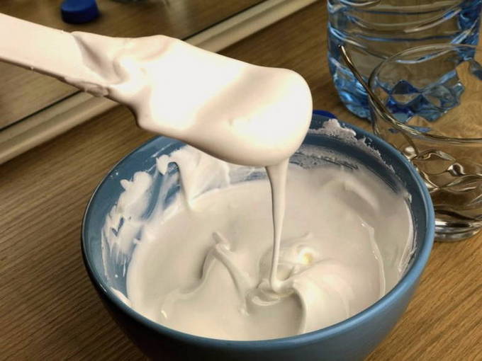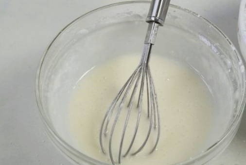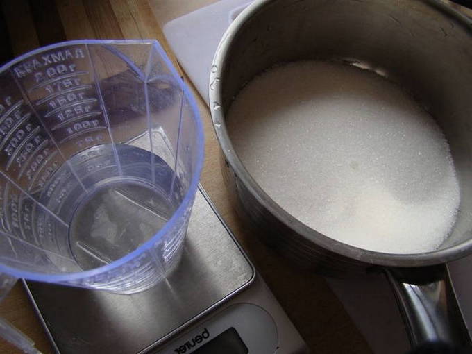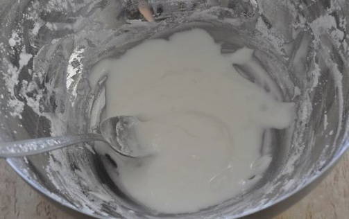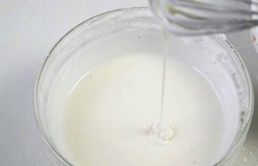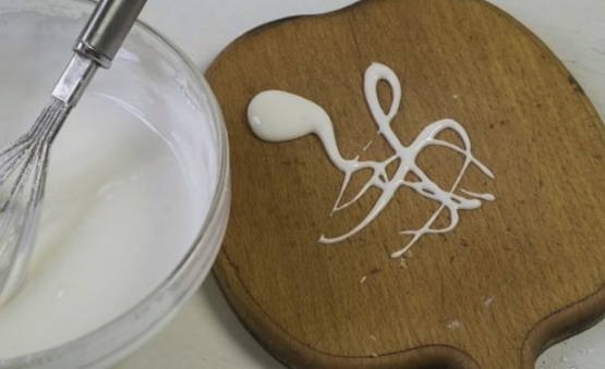 - Vervolgens verdunnen we het glazuur met water in een verhouding van 1 kopje glazuur - 2,5 theelepels water.