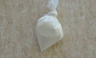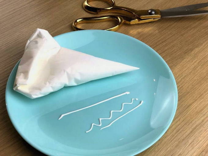 - We verplaatsen het glazuur in de folie in een spuitzak, snijden de punt af en plaatsen het mondstuk.