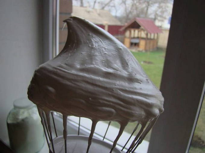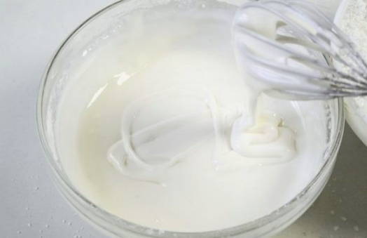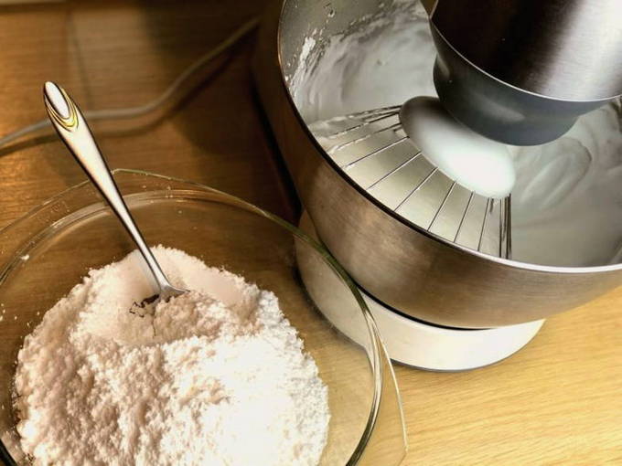 - Giet een eetlepel poedersuiker bij het eiwit en klop alles met een mixer op lage snelheid tot een dikke massa.