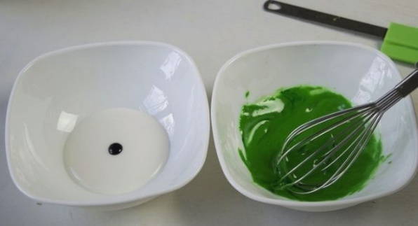 - Verdeel het glazuur in delen en verf in de gewenste kleuren met kleurstof.