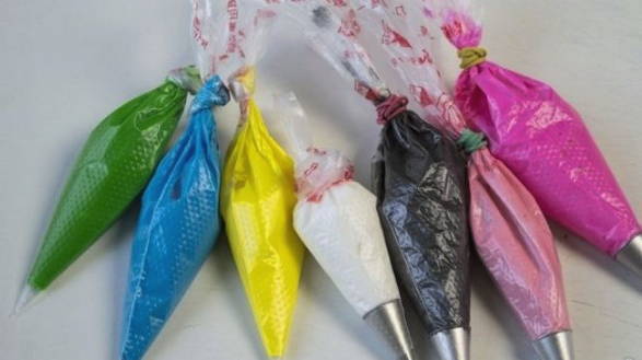 - We leggen het afgewerkte gekleurde glazuur in spuitzakken. Veel succes met je decoratie!