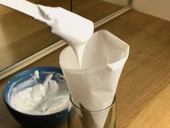 - Breng het glazuur over op de bakpapiercornet en vul deze ongeveer halverwege.