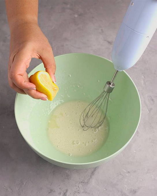 - Voeg vervolgens citroensap toe, al kloppend.