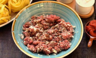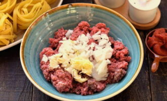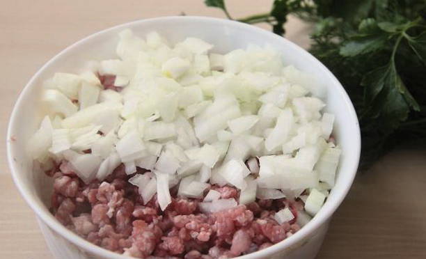 - We schuiven het gehakt in een aparte container en mengen het met een fijngehakte ui.