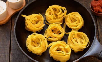 - Vervolgens brengen we de gekookte nesten over naar een ovenschaal. We gieten ook anderhalve glas water in een aparte container, waarin de pasta werd gekookt.