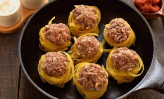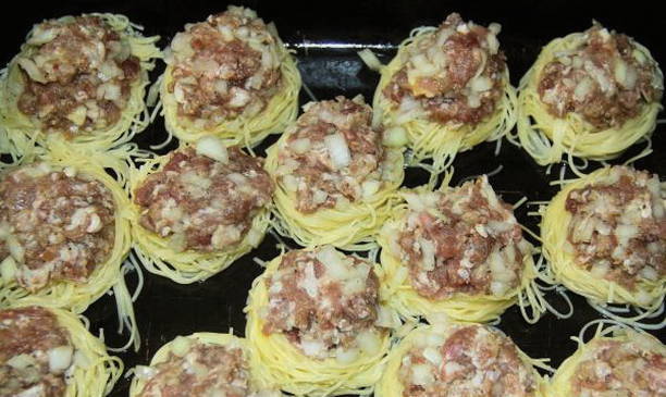We boetseren kleine balletjes van gehakt en plaatsen ze op de nesten, licht aandrukkend.