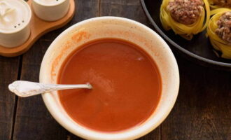 - In een aparte container verdunnen we de zure room in 200 ml heet water, zout, peper en gieten het resulterende mengsel van pasta. Ze moeten ongeveer voor de helft bedekt zijn met vloeistof.
