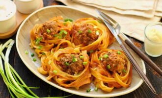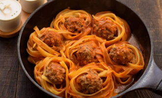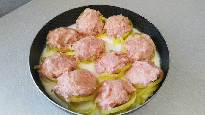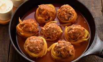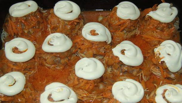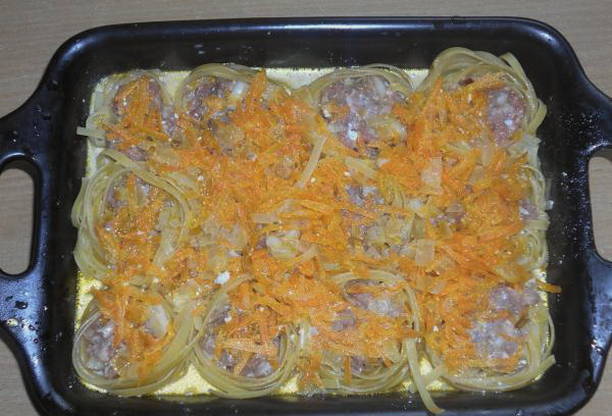 De pasta wordt een beetje gekookt en vervolgens overgebracht naar een ovenschaal. Er worden balletjes gehakt op gelegd en alles wordt overgoten met een saus van wortelen, uien, zure room en tomatenpuree. Ook wordt aan elk nest een beetje mayonaise toegevoegd. Het gerecht wordt ongeveer 40 minuten in de oven gaar.