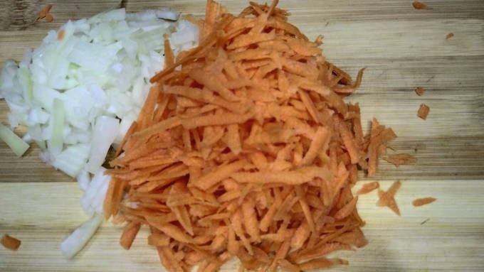 - Was de wortelen zorgvuldig, schil ze en wrijf ze op een grove rasp. Snijd de andere helft van de ui fijn.