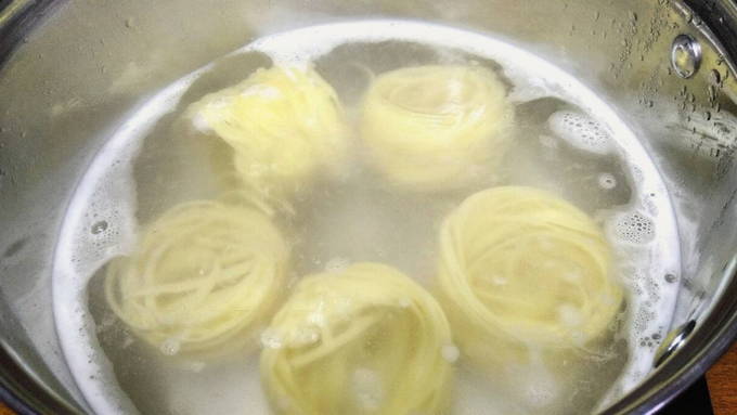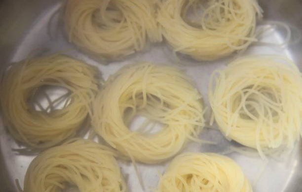 - We sturen onze pasta-nestjes in kokend zout water en houden ze daar ongeveer 30 seconden zodat ze een beetje zacht worden.