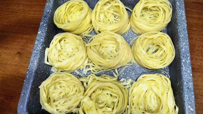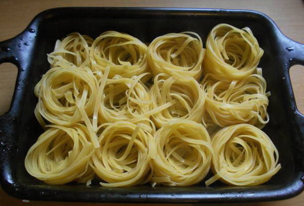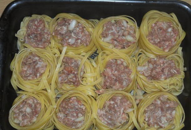 Hoe gehakte pasta-nesten in de oven koken?