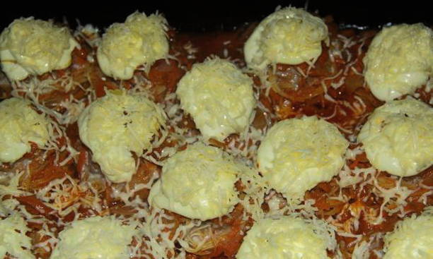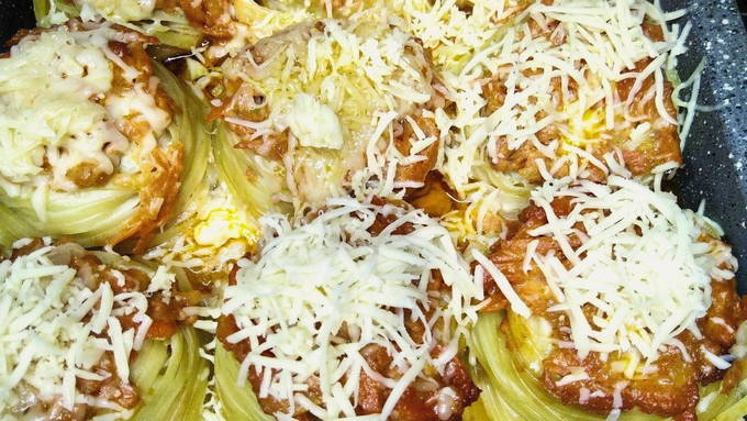 - Verwijder daarna de folie en bestrooi de nesten met gehakt met geraspte harde kaas. We zetten hem nog 15-20 minuten terug in de oven om de kaas te bakken. We dekken niet meer af met folie.