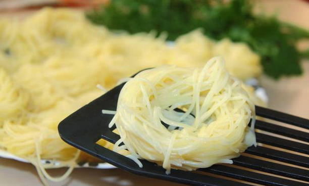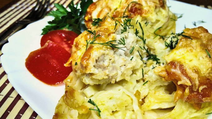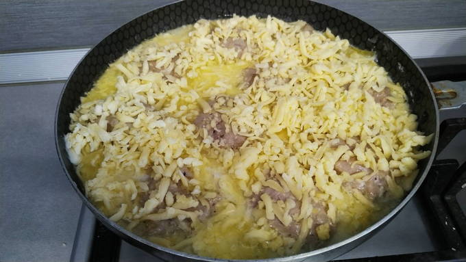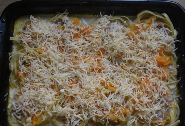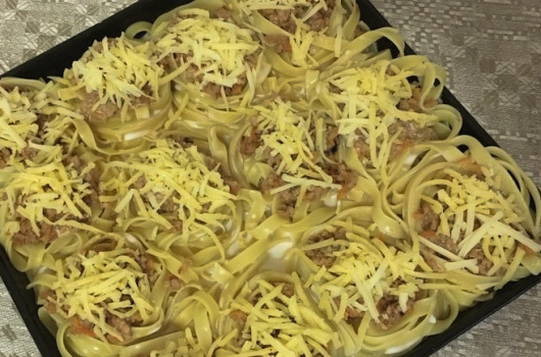 Om te beginnen wordt de pasta gekookt, vervolgens wordt het gehakt in de nesten geplaatst. Alles is gevuld met gefrituurde wortelsaus met uien, zure room en ketchup. De vorm wordt afgedekt met folie en 10 minuten voor het einde van de bereiding bestrooit u de pasta met het gehakt met kaas.