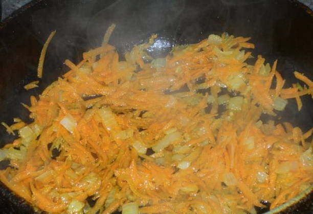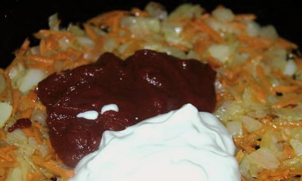 - Verhit plantaardige olie in een koekenpan en bak de wortelen en uien hierin tot ze half gaar zijn. Vervolgens sturen we zure room, ketchup naar de groenten, mengen goed en koken nog een paar minuten. Voeg naar smaak peper en zout toe en meng opnieuw.
