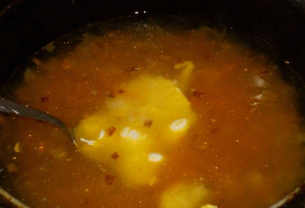 - Giet vervolgens 2 kopjes water in de pan, voeg zure room, zout, peper toe en meng alles goed. Breng de vloeistof aan de kook en haal van het vuur.