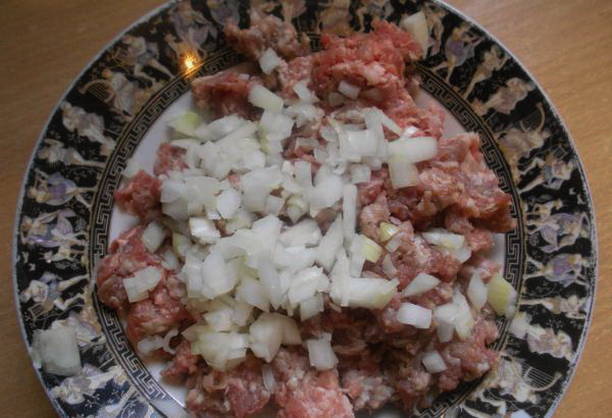 - Doe het gehakt en varkensvlees in een aparte bak. We maken een ui schoon, hakken fijn en sturen deze naar het gehakt. We voegen ook 50 ml koud water en griesmeel toe. Meng alles goed door elkaar en laat ongeveer 20 minuten staan zodat het griesmeel opzwelt.