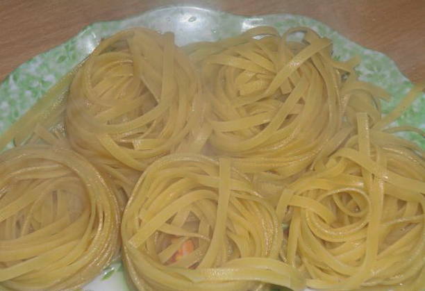 Om te koken hebben we pasta-nestjes, gehakt, uien, wortelen, zure room, harde kaas, plantaardige olie en water nodig. Pasta met gehakt wordt ongeveer 40 minuten gebakken en blijkt erg aromatisch en smakelijk te zijn.