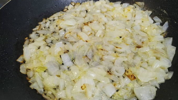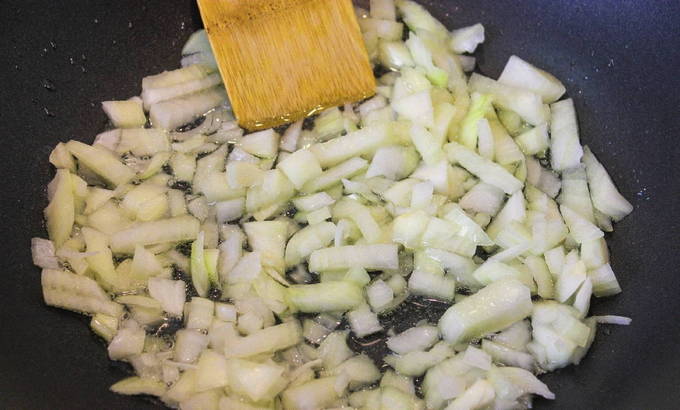 - Verhit plantaardige olie in een koekenpan en fruit hierin 2 fijngehakte uien tot ze transparant zijn.