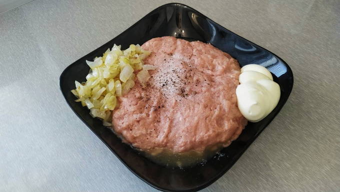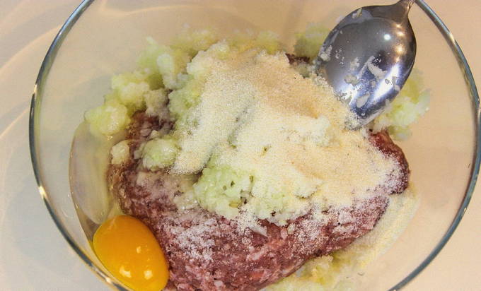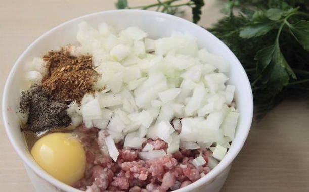 - We nemen een geschikte diepe container en leggen het gehakt daar. Snijd de helft van de ui fijn en stuur deze naar het gehakt. Breek vervolgens een ei, zout, peper naar smaak en meng alles goed door elkaar.