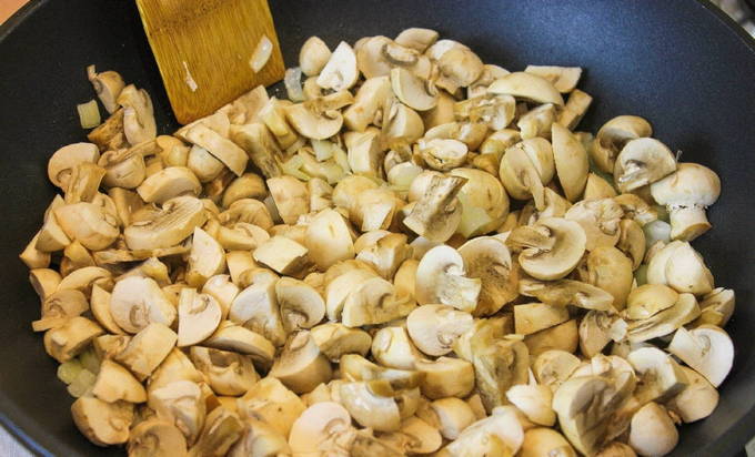 - We wassen de champignons grondig, snijden ze in kleine stukjes en sturen ze met uien naar de pan. Voeg zout en peper naar smaak toe, meng en bak 10-15 minuten.