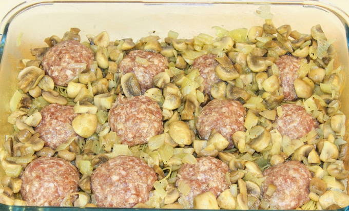 - We boetseren kleine balletjes van het afgewerkte gehakt en leggen ze bovenop de nesten. Verdeel vervolgens de gebakken champignons en uien gelijkmatig.