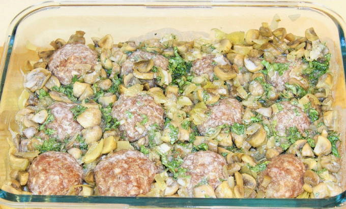 Champignons worden gebakken met uien in een pan. De nesten worden gevuld met runder- en varkensvleesgehakt en er worden gebakken champignons op gelegd. Vervolgens wordt alles met zure roomsaus met water gegoten en 40 minuten gebakken. Bestrooi de afgewerkte schaal met kruiden en kaas erover.