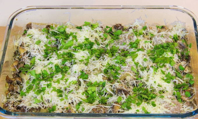- Als er weinig vloeistof in de vorm zit, voeg dan de benodigde hoeveelheid water toe. Bestrooi alles erover met geraspte harde kaas.