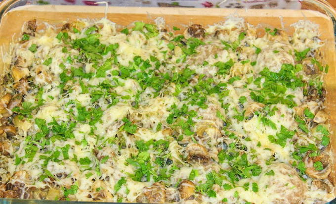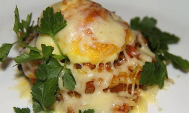 Dit gerecht is eenvoudig genoeg om te bereiden en zal het perfecte en heerlijke diner zijn. Wij bieden u de mogelijkheid om in de oven te koken, met kaas, zure room, room, champignons, tomaten en tomatenpuree.