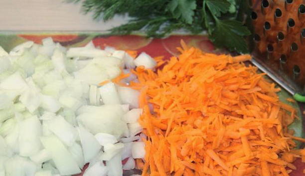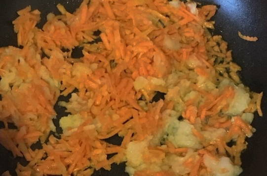 - Schil de ui en hak hem fijn en rasp de wortelen op een grove rasp. Verhit plantaardige olie in een koekenpan en bak hierin groenten tot ze zacht zijn.