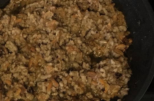 - We sturen de helft van de gesnipperde ui naar een container met gehakt.