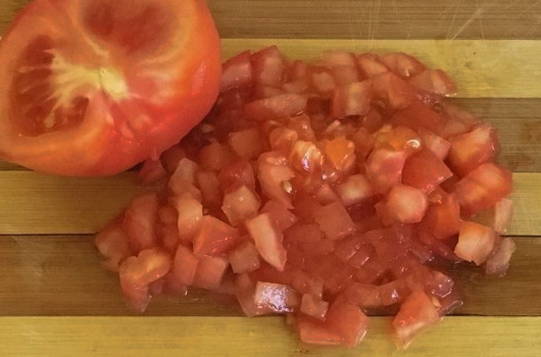 - Verbrand de tomaat met kokend water en verwijder de schil. Snijd het in kleine blokjes en gooi het in een koekenpan met gehakt, uien en wortelen. Laat op middelhoog vuur ongeveer 10 minuten sudderen tot het gehakt volledig gaar is.