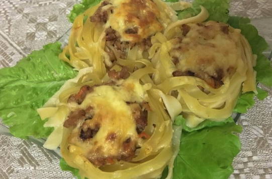 - Leg de gekookte nesten voorzichtig in een ovenschaal en leg het gebakken gehakt met groenten erop. Giet alles met de resulterende saus en strooi er geraspte harde kaas over. Verwarm de oven voor op 180OC en zet het formulier er 20 minuten in.