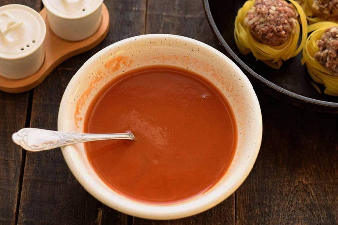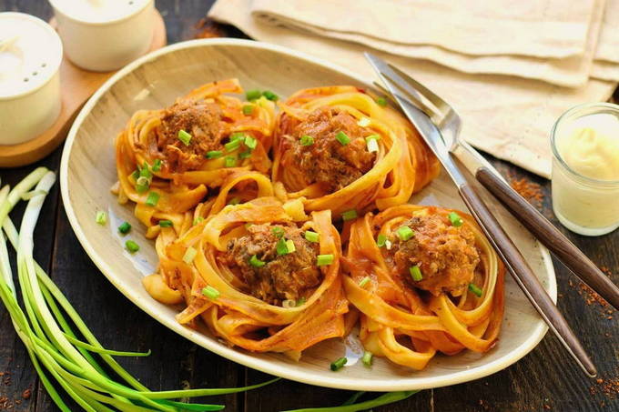De pasta wordt een beetje gekookt en vervolgens overgebracht naar een ovenschaal. Er worden balletjes gehakt op gelegd en alles wordt overgoten met een saus van wortelen, uien, zure room en tomatenpuree. Ook wordt aan elk nest een beetje mayonaise toegevoegd. Het gerecht wordt ongeveer 40 minuten in de oven gaar.