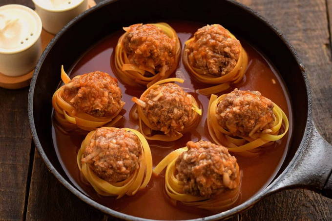 - We vormen kleine balletjes van het afgewerkte gehakt en leggen deze op de pasta. Voor één nest is ongeveer 1 eetlepel gehakt nodig.