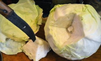 Laten we de kool klaarmaken. Snijd met een scherp mes voorzichtig de stronk uit.