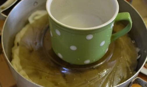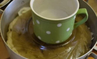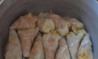 Leg een bord op de koolrolletjes (iets kleiner in diameter dan de pan) en leg de lading erop. Vul met kokend water zodat het bord een paar centimeter "zakt". Kook op laag vuur gedurende 40 minuten na het koken.