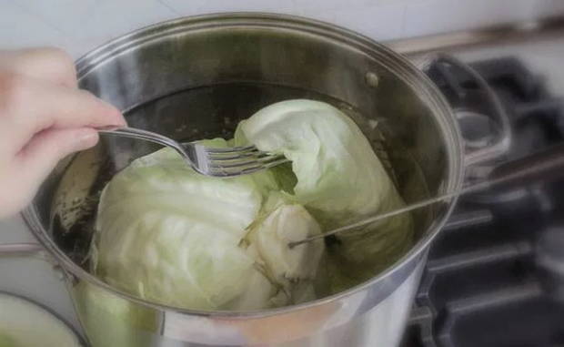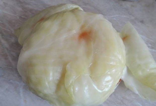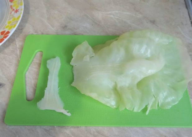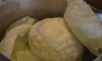 - Als de kool zacht is geworden, haal je hem eruit en geef je hem de tijd om iets af te koelen. We scheiden grote mooie bladeren.