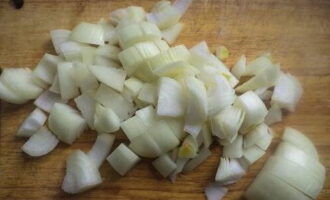 - Laten we de saus klaarmaken. Om het te bereiden, hak de ui fijn en bak deze in plantaardige olie.