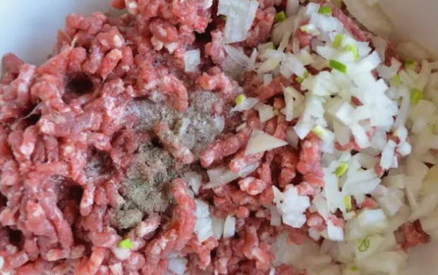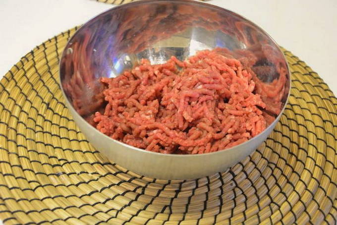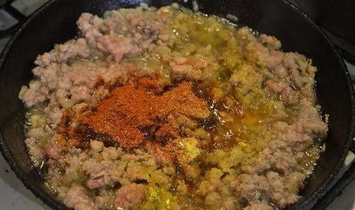 We sturen gehakte uien naar een voorverwarmde pan en koken tot ze transparant zijn. Voeg vervolgens het gehakt toe om te braden en bak tot het half gaar is. Voeg in hetzelfde stadium je favoriete kruiden, zout en zwarte peper toe aan het vlees - meng alle ingrediënten goed.