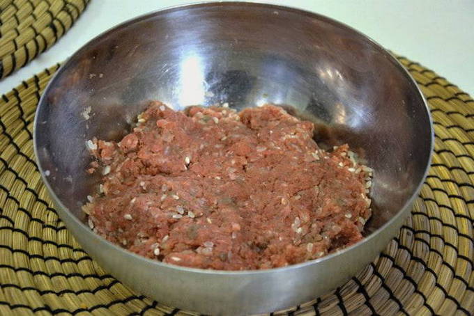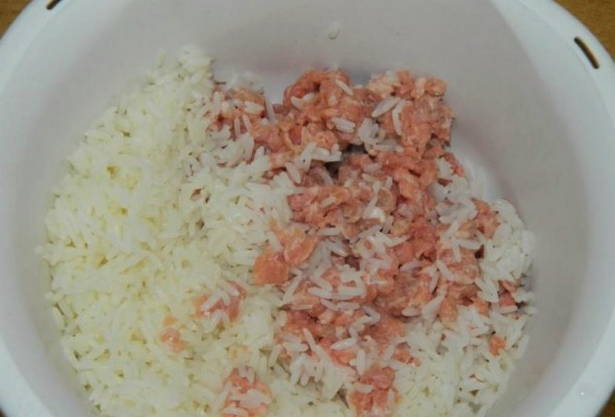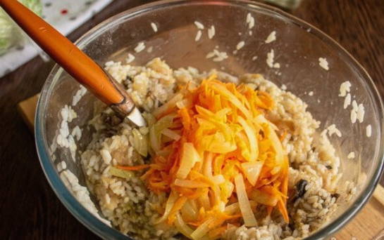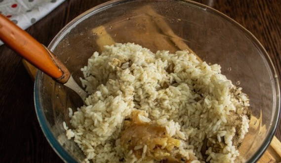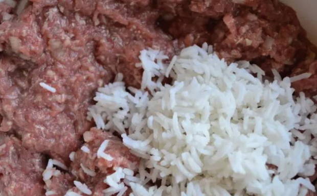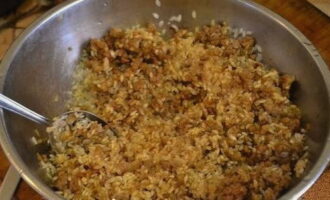 - Voeg gekookte rijst toe aan de vleesmassa.