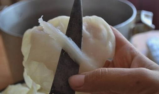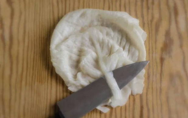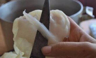 - Om de vellen gemakkelijk van de koolkop te scheiden, snijden we de stronk uit met een scherp mes.
