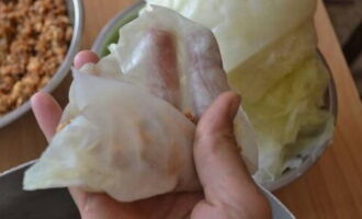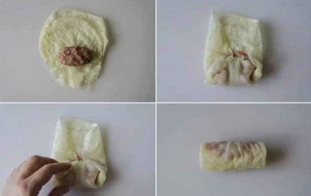 - Laten we beginnen met monteren. Leg een kotelet van de vulling op het zacht geworden koolblad en sluit het als een envelop.