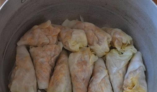 - Doe een beetje saus op de bodem van een grote pan, dan een paar koolbladeren, rauwe gevulde koolrolletjes strak tegen elkaar (giet ze met jus) en leg er nog een paar blaadjes bovenop.