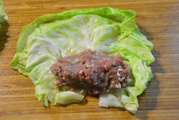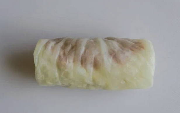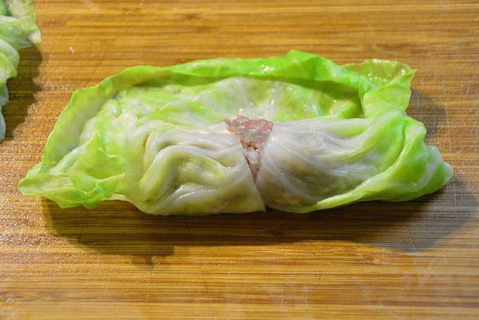 - We vormen koolrolletjes. Leg een beetje vleesvulling op de rand van het koolblad, draai het van onder naar boven, en draai dan de zijdelen en draai het naar het einde toe. Hetzelfde doen we met alle bladeren en gehakt.