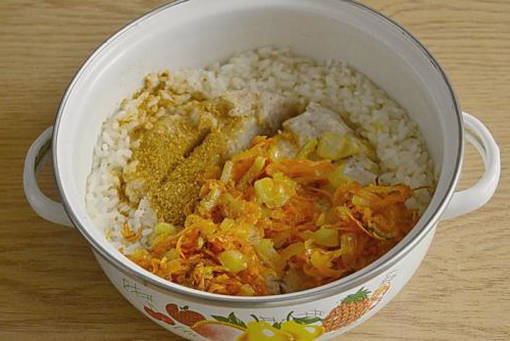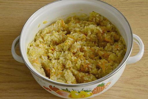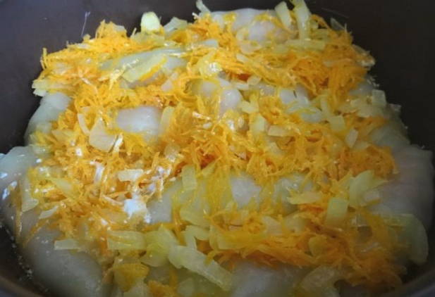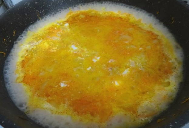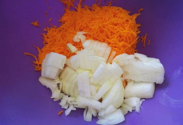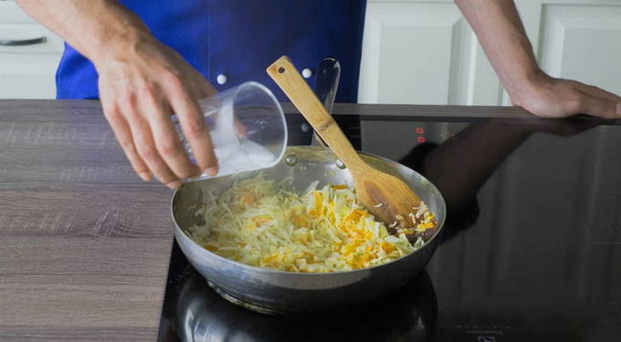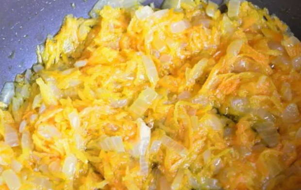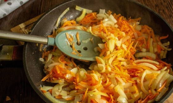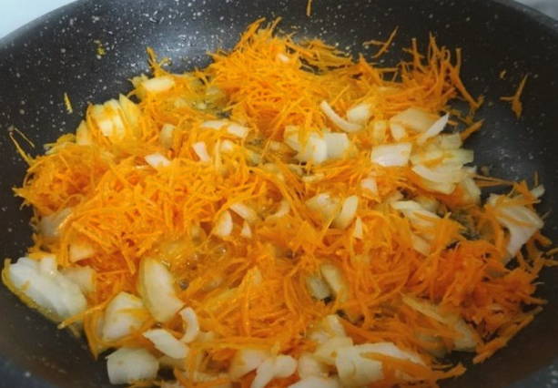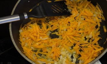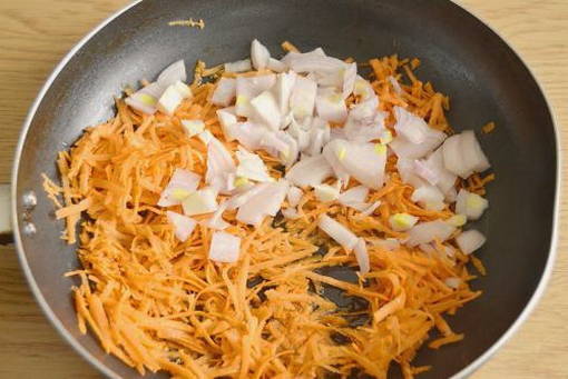 - Verhit een paar eetlepels olie in een koekenpan en fruit de geraspte wortelen en uien, in dunne halve ringen gesneden. Fruit onder voortdurend roeren de groenten tot ze zacht zijn. We laten een paar lepels frituren voor de vulling.