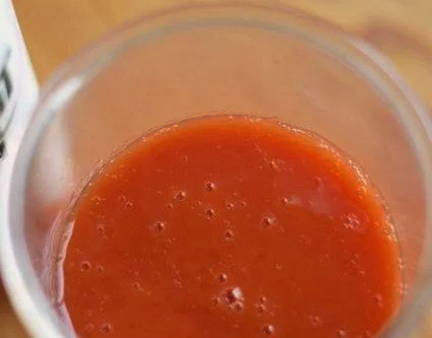 - Ook voor jus hebben we tomatensap nodig (je kunt tomatenpuree verdund met water vervangen), we meten de benodigde hoeveelheid af.