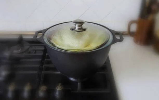 - We sturen de gerechten naar het fornuis en laten de inhoud van de pan koken. Zet daarna het vuur lager en laat ongeveer 40-45 minuten onder het deksel sudderen.