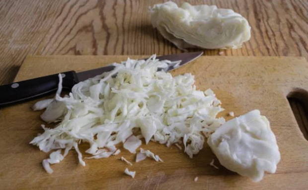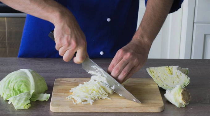 - Allereerst behandelen we de witte kool: met een scherp mes maken we diepe sneden in de buurt van de stronk zodat de bladeren er makkelijker af komen.