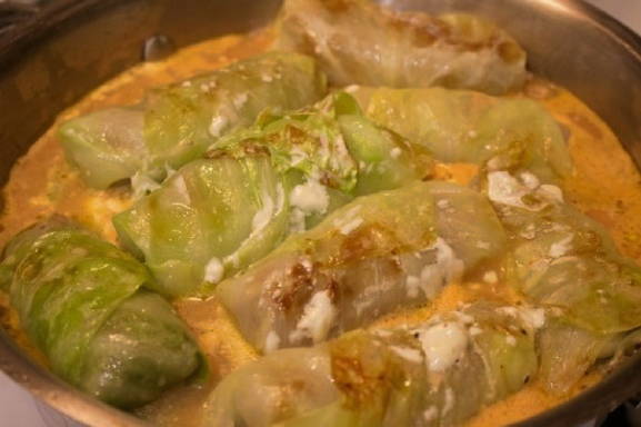 - Leg de gevulde koolrolletjes stevig op de zure room-tomatensaus.